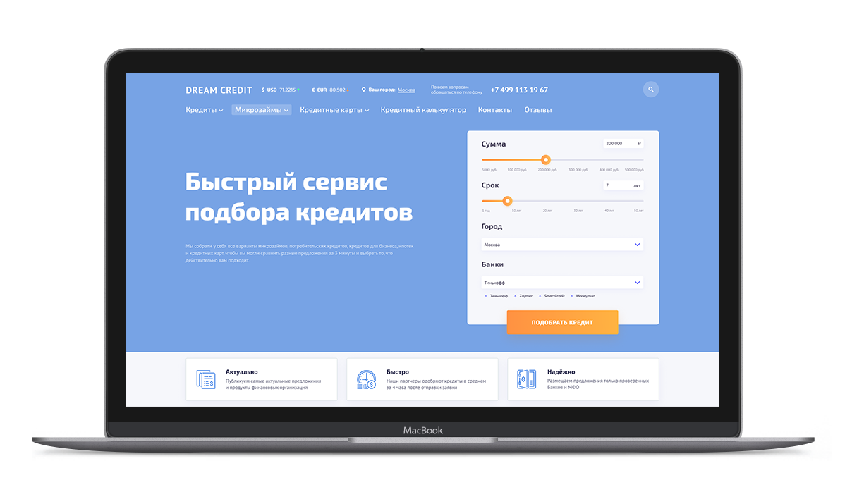 Dream Credit - это онлайн-сервис по подбору кредитов. Сайт помогает посетителям найти и сравнить предложения по банковским продуктам от партнёров.