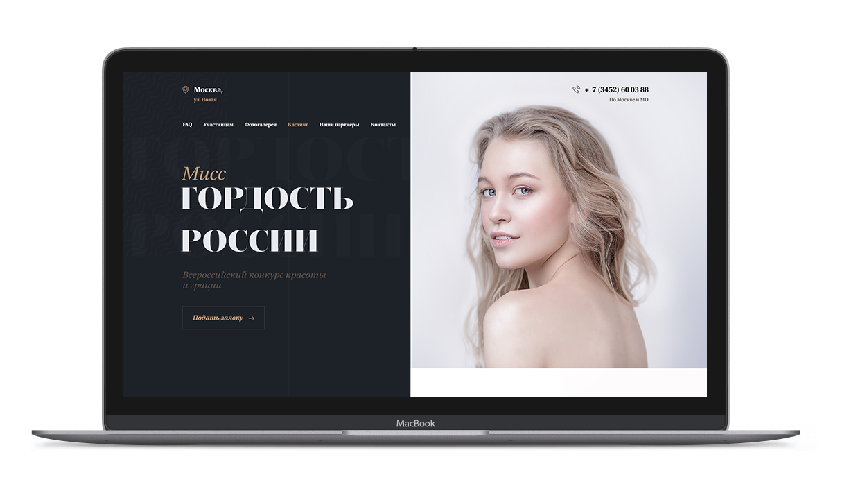 Разработка дизайна сайта для конкурса красоты «Мисс Гордость России». Клиент хотел сайт в журнальной стилистике, с изысканной типографикой и тёмным фоном. Важно было сделать сайт с акцентом на натуральную красоту девушек-участниц.