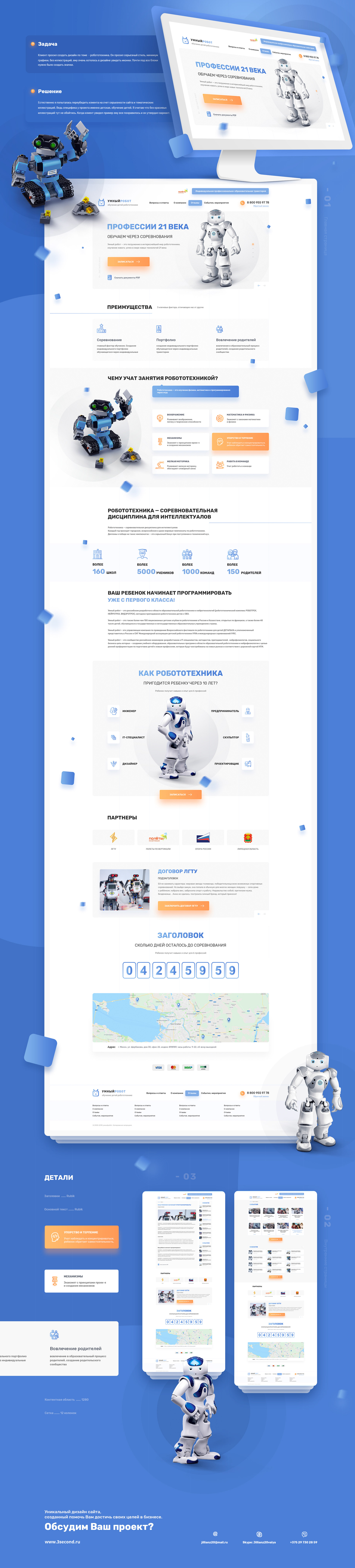 Клиент просил создать дизайн по теме — робототехника. Он просил серьезный стиль, минимум графики, без иллюстраций, ему очень хотелось в дизайне увидеть иконки. Почти под все блоки нужно было создать значки.